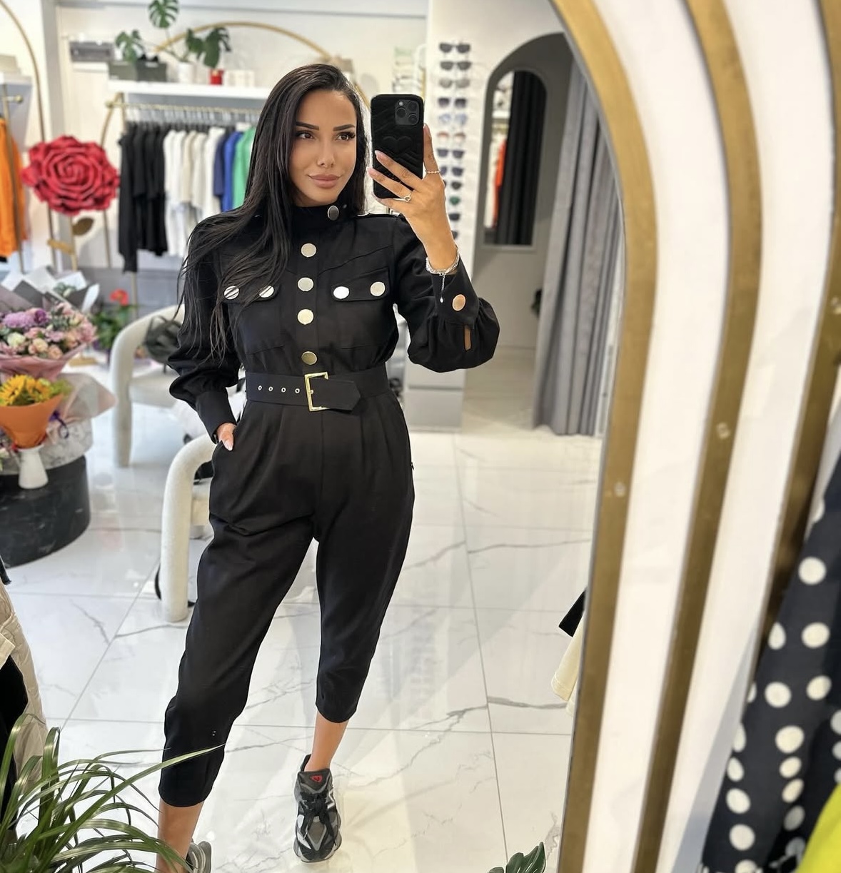 Gold Düğme Detaylı Kemerli Siyah Tulum