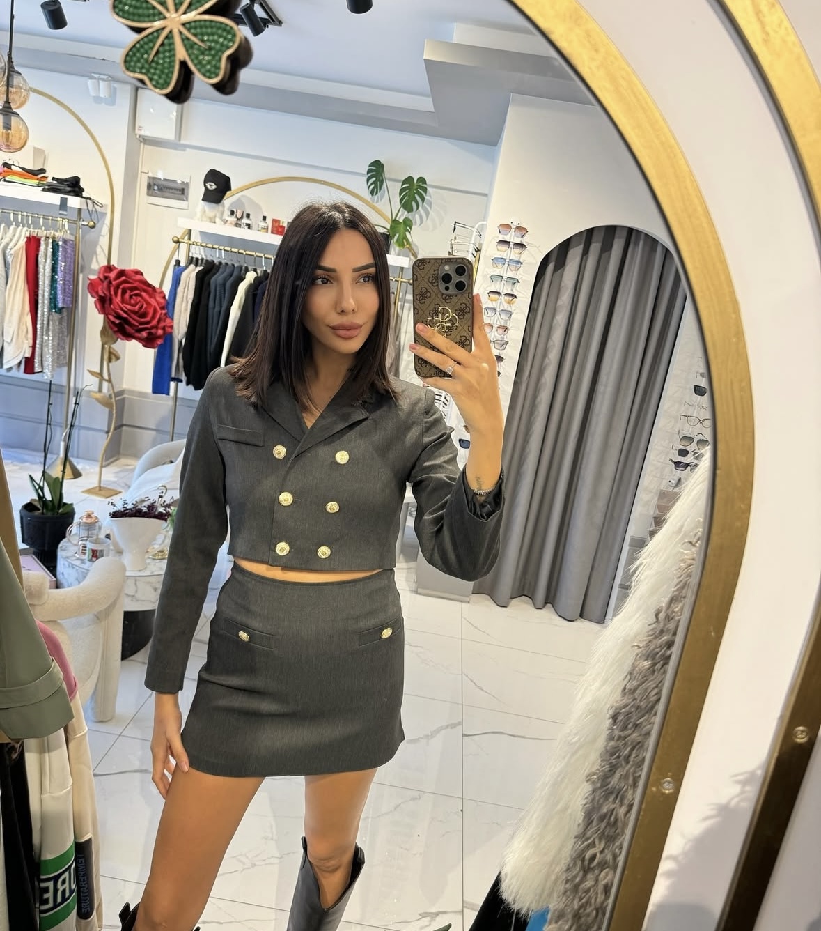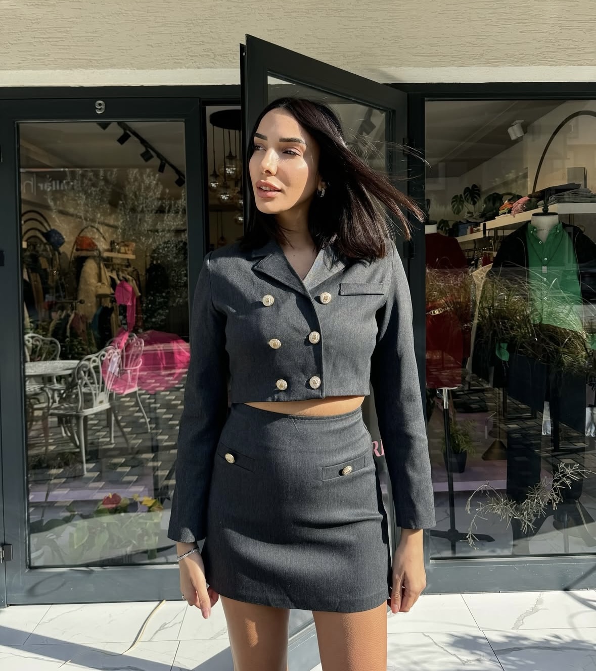 Gold Düğmeli Kısa Blazer & Mini Etek Takım – Füme
