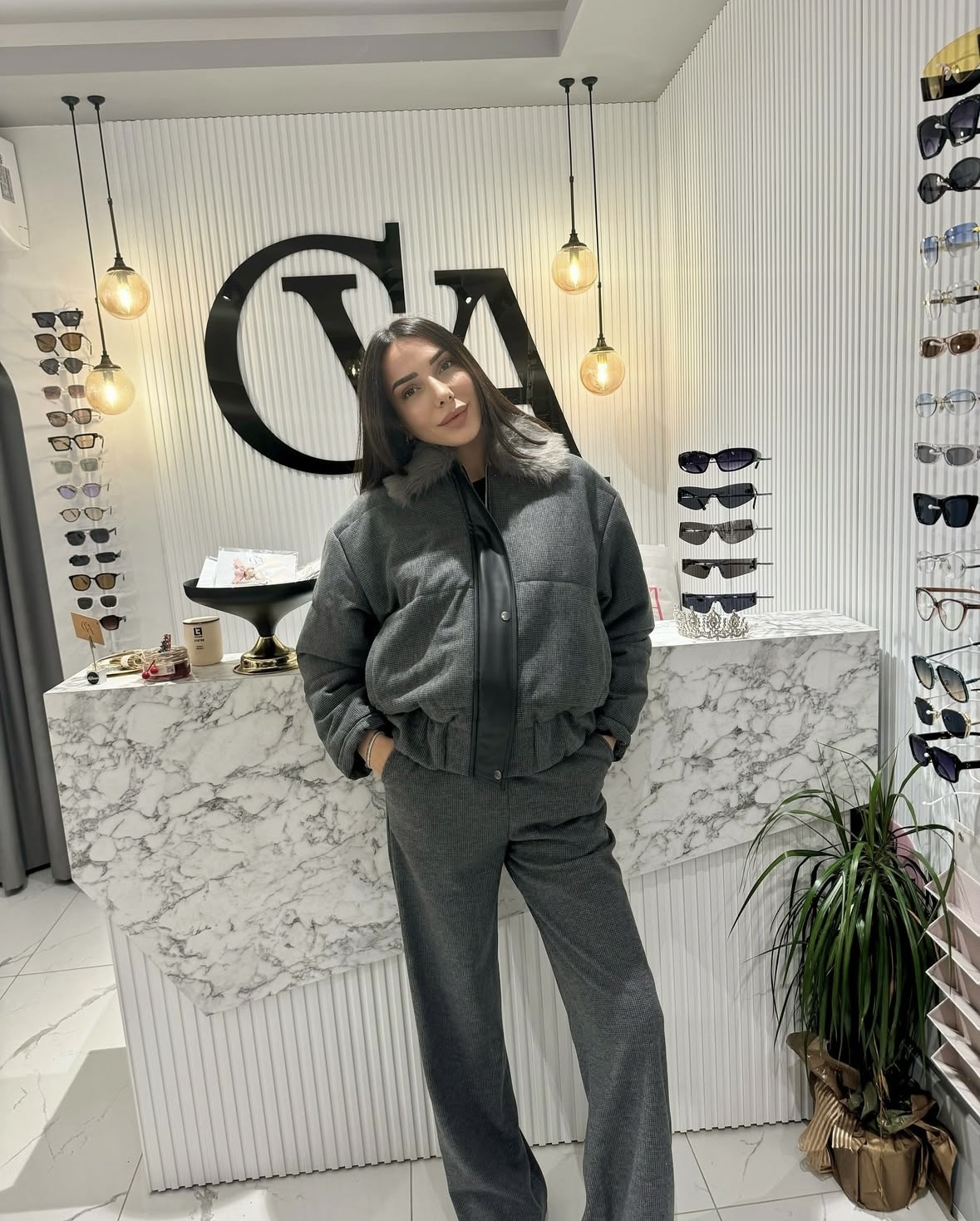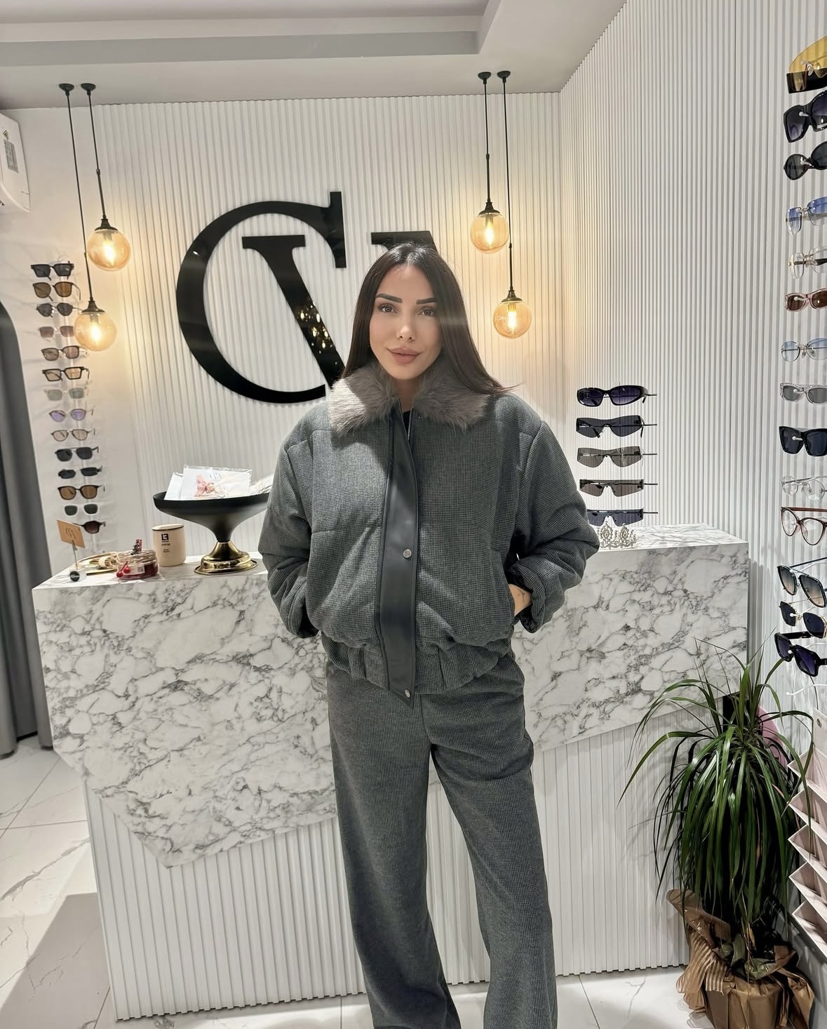 Yakası Kürk Detay Ceketli Pantolon Füme Renk Takım